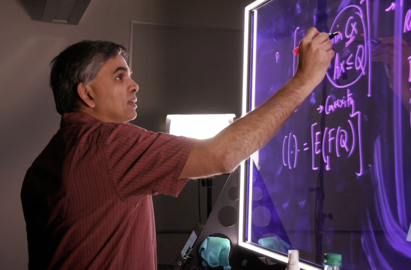 Dr. Mahesh Nagarajan is one of many UBC Sauder faculty members that uses technology during his lectures, including the electronic lightboard. Instructors stand before a camera and as they write on a glass panel, their notes appear correctly oriented for the class.
